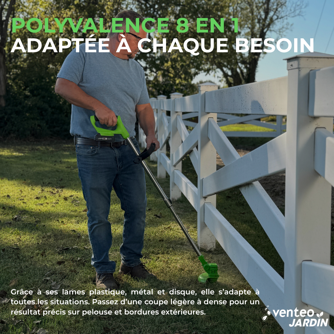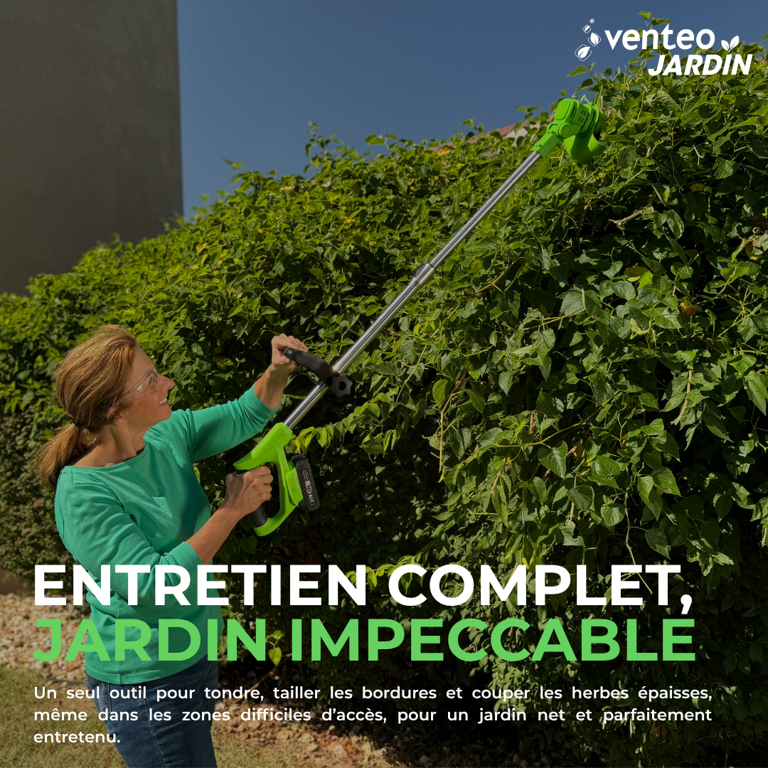 L’outil multifonction électrique sans fil tondeuse & taille-haie est conçu pour 👉🏼 entretenir votre jardin avec précision, tailler vos haies et tondre votre pelouse facilement, le tout avec un seul appareil pratique, sans contrainte de fil et en toute liberté de mouvement.